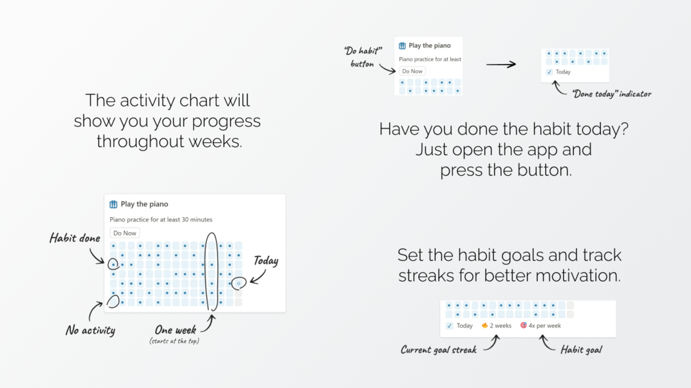 Do you want to master a new skill, keep yourself fit or just get used to something? Habit tracking is like a game where you mark off each time you do something good for yourself.