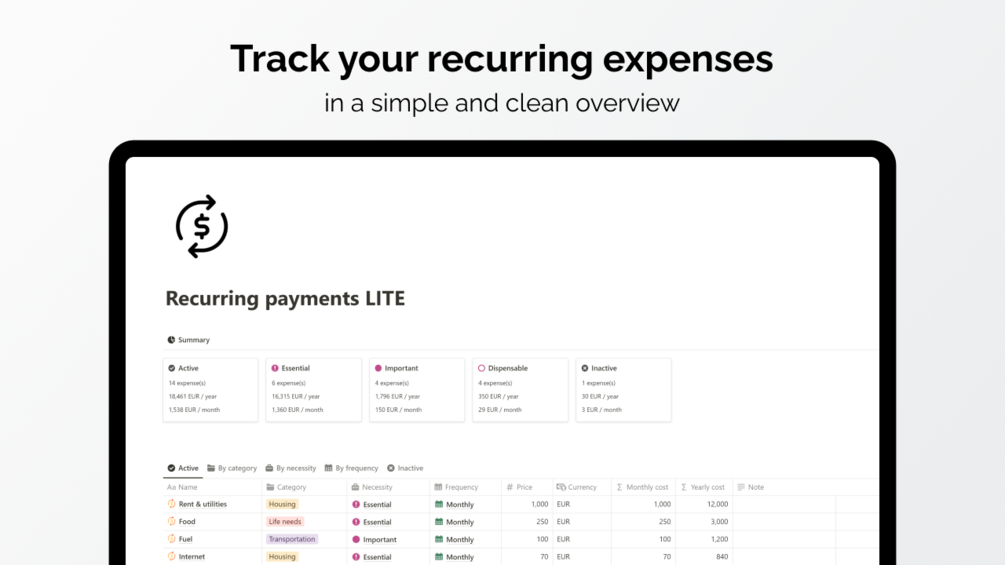 Keep track of your recurring expenses in a simple and clean overview